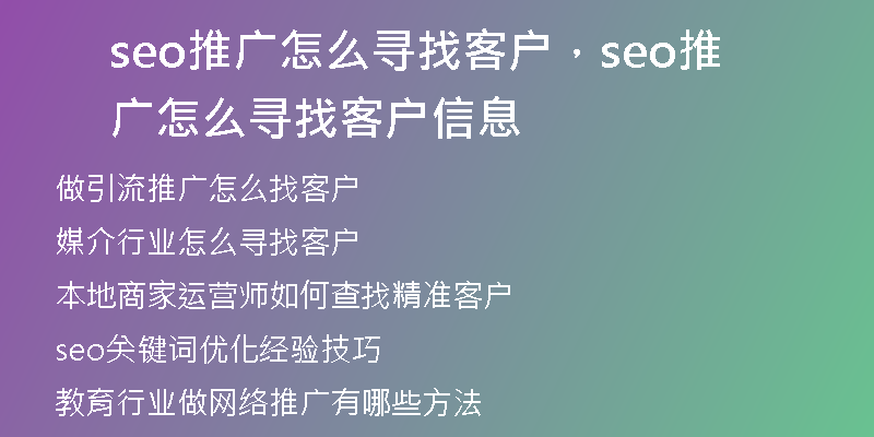 本篇文章給大家談?wù)剆eo推廣怎么尋找客戶,以及seo推廣怎么尋找客戶信息對應(yīng)的知識點,文章可能有點長,但是希望大家可以閱讀完,增長自己的知識,最重要的是希望對各位有所幫助,可以解決了您的問題,不要忘了收藏本···