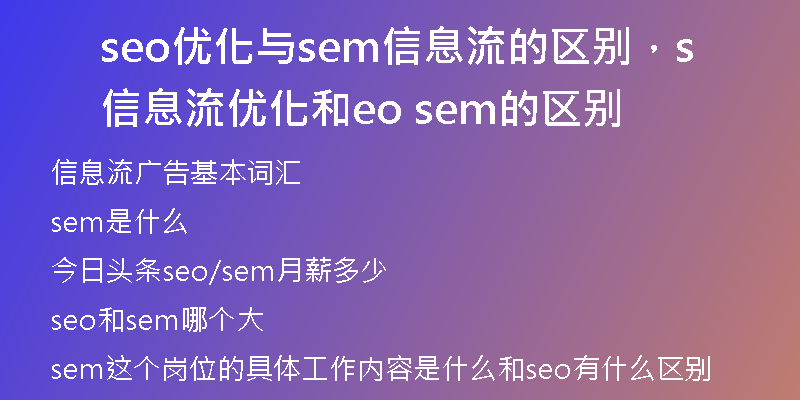 2024-03-12站長百科大家好,感謝邀請,今天來為大家分享一下seo優(yōu)化與sem信息流的區(qū)別的問題,以及和信息流優(yōu)化和seosem的區(qū)別的一些困惑,大家要是還不太明白的話,也沒有關(guān)系,因?yàn)榻酉聛韺榇蠹曳窒?,希望可以幫助到大家,解決大家···