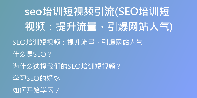 2024-03-13站長百科SEO培訓(xùn)短視頻:提升流量,引爆網(wǎng)站人氣在當(dāng)下競爭激烈的互聯(lián)網(wǎng)時(shí)代,擁有一個(gè)高流量的網(wǎng)站是每個(gè)企業(yè)主的夢想。然而,要想實(shí)現(xiàn)這個(gè)目標(biāo)并非易事。SEO(SearchEngineOptimization)是一種提升網(wǎng)站在搜索引擎中排名的···